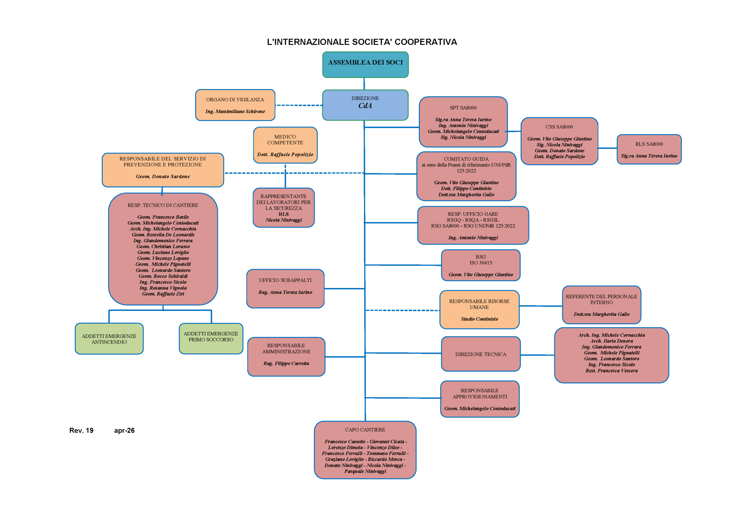 La Cooperativa, da sempre, si è contraddistinta per la trasparenza e la professionalità nei rapporti di lavoro intrattenuti con gli Enti e con i clienti, nonché con tutti i propri collaboratori dipendenti e, ad oggi, L’INTERNAZIONALE Soc. Coop. vanta un organico di circa 90 unità tra impiegati e maestranze.